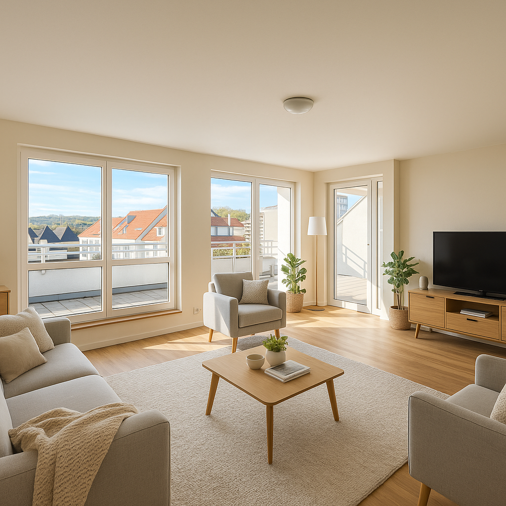 Wohnzimmer mit Zugang zur Terrasse / bodentiefe Fenster / Rollos