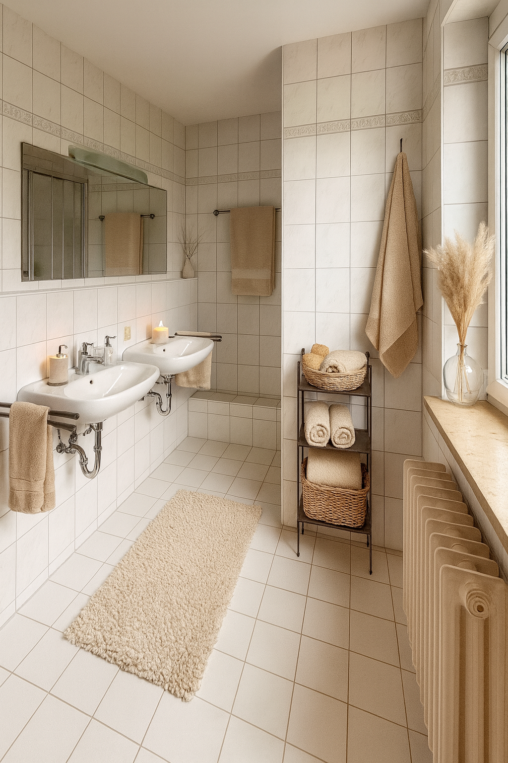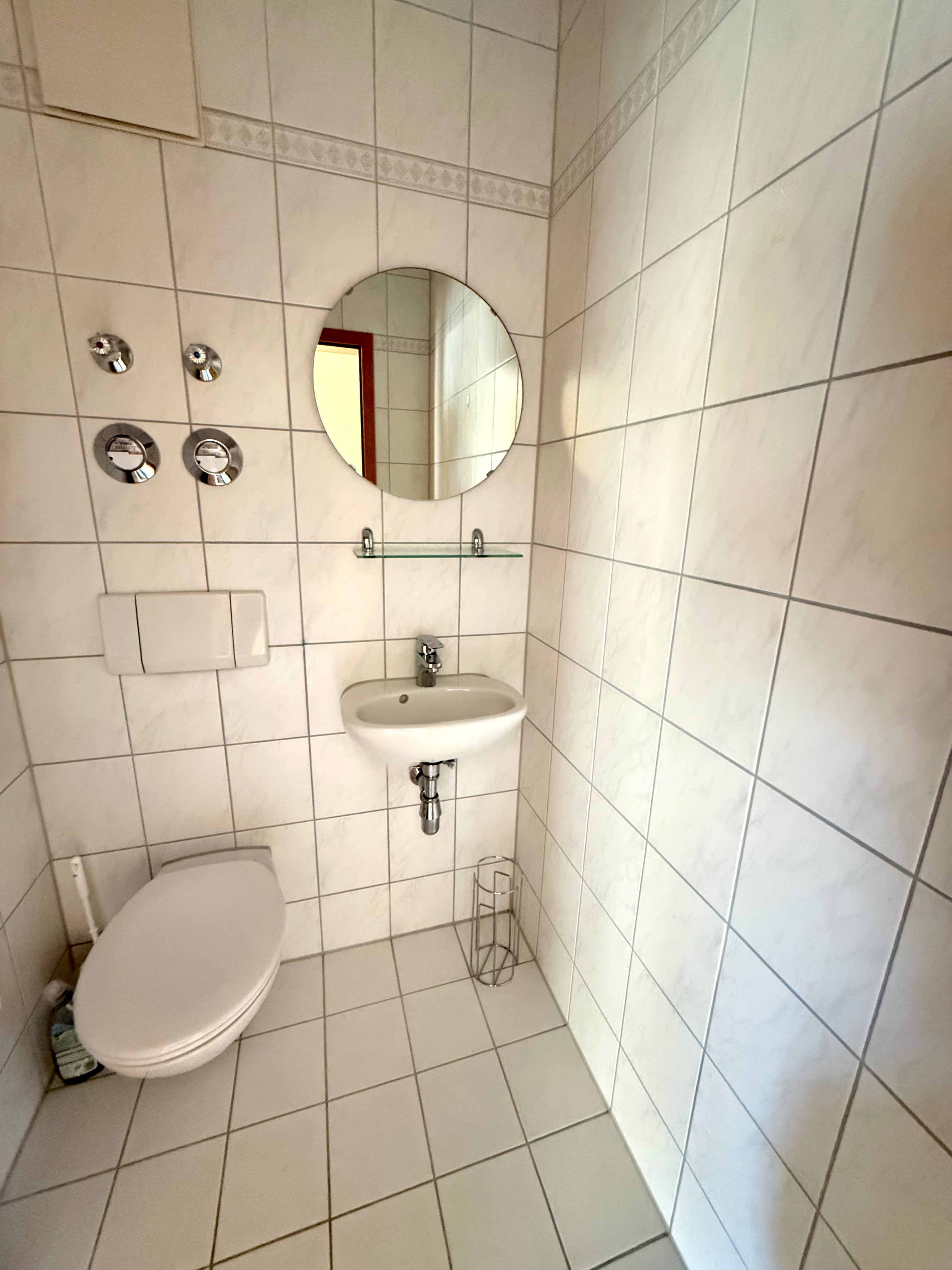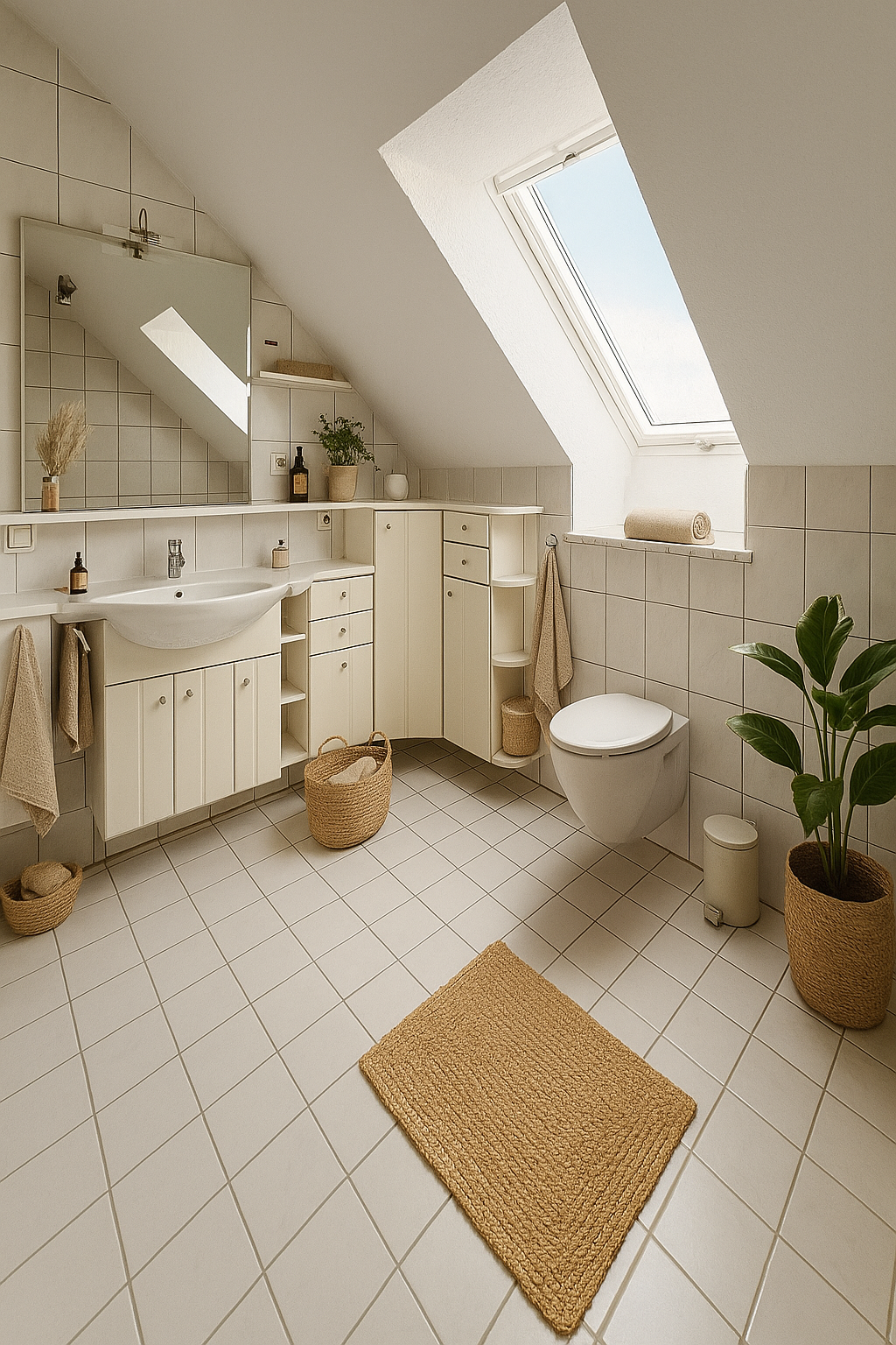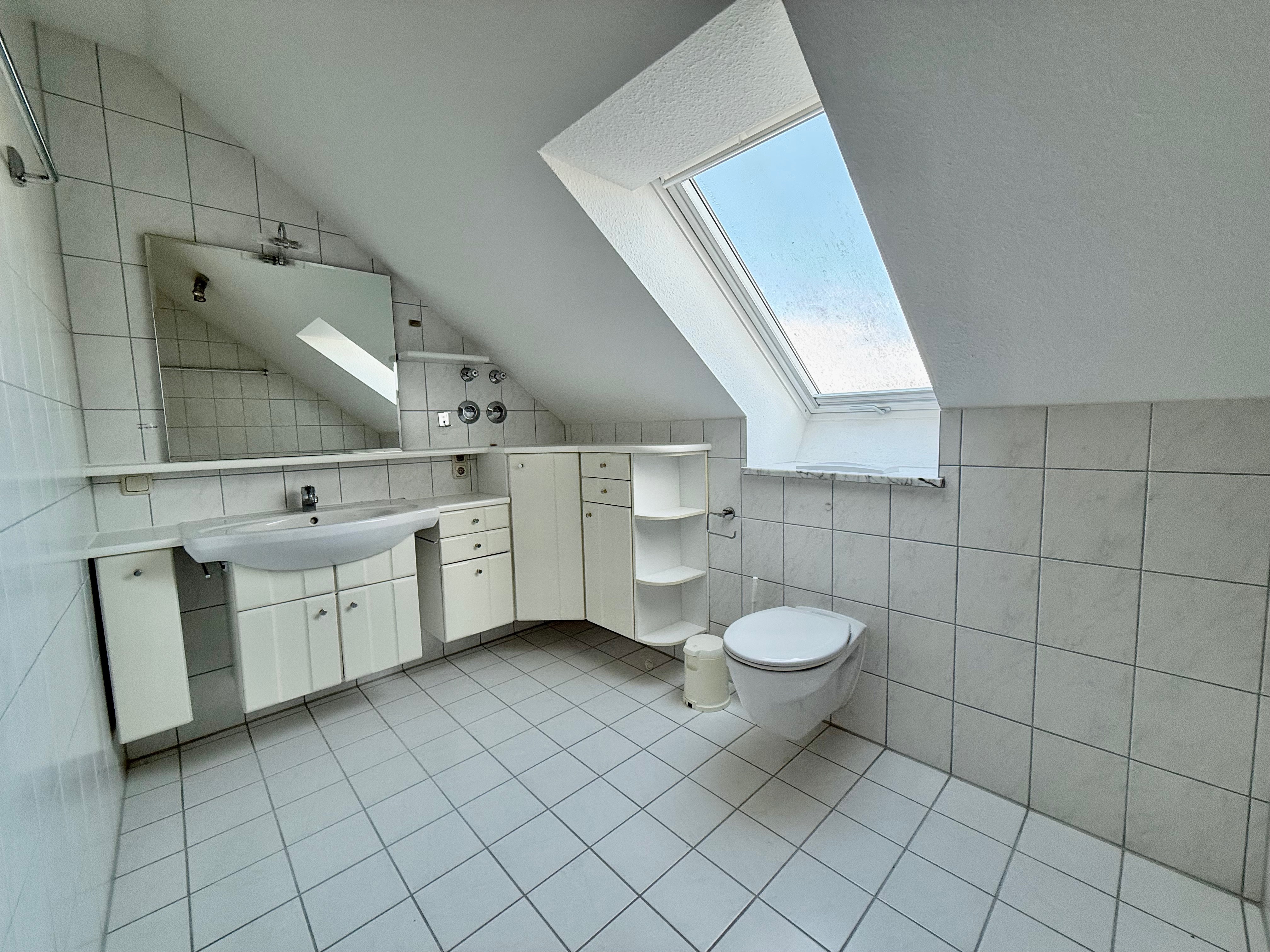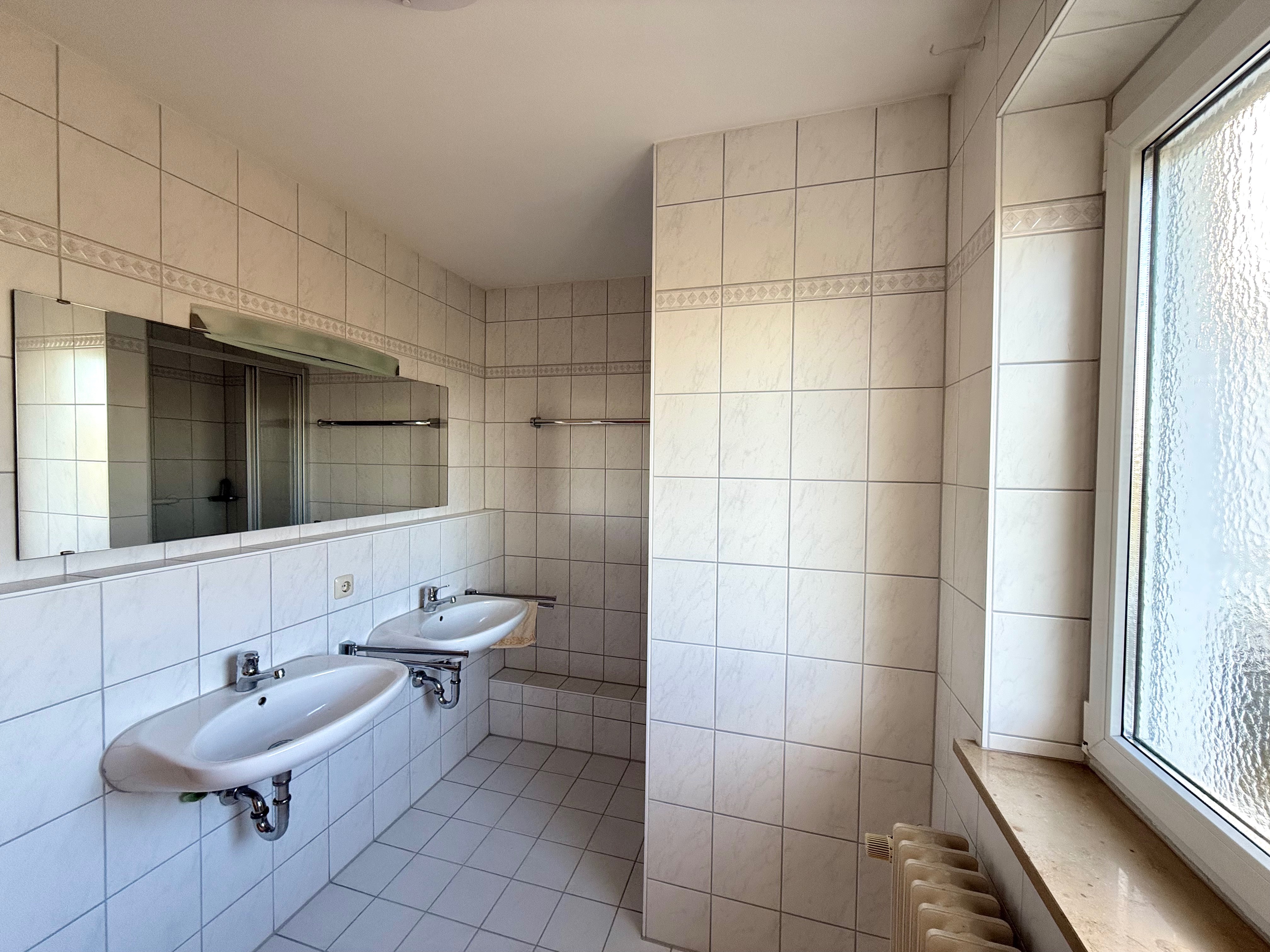 Tageslichtbad mit Doppelwaschbecken, Dusche, Einbauschrank, Waschmaschinenanschluss