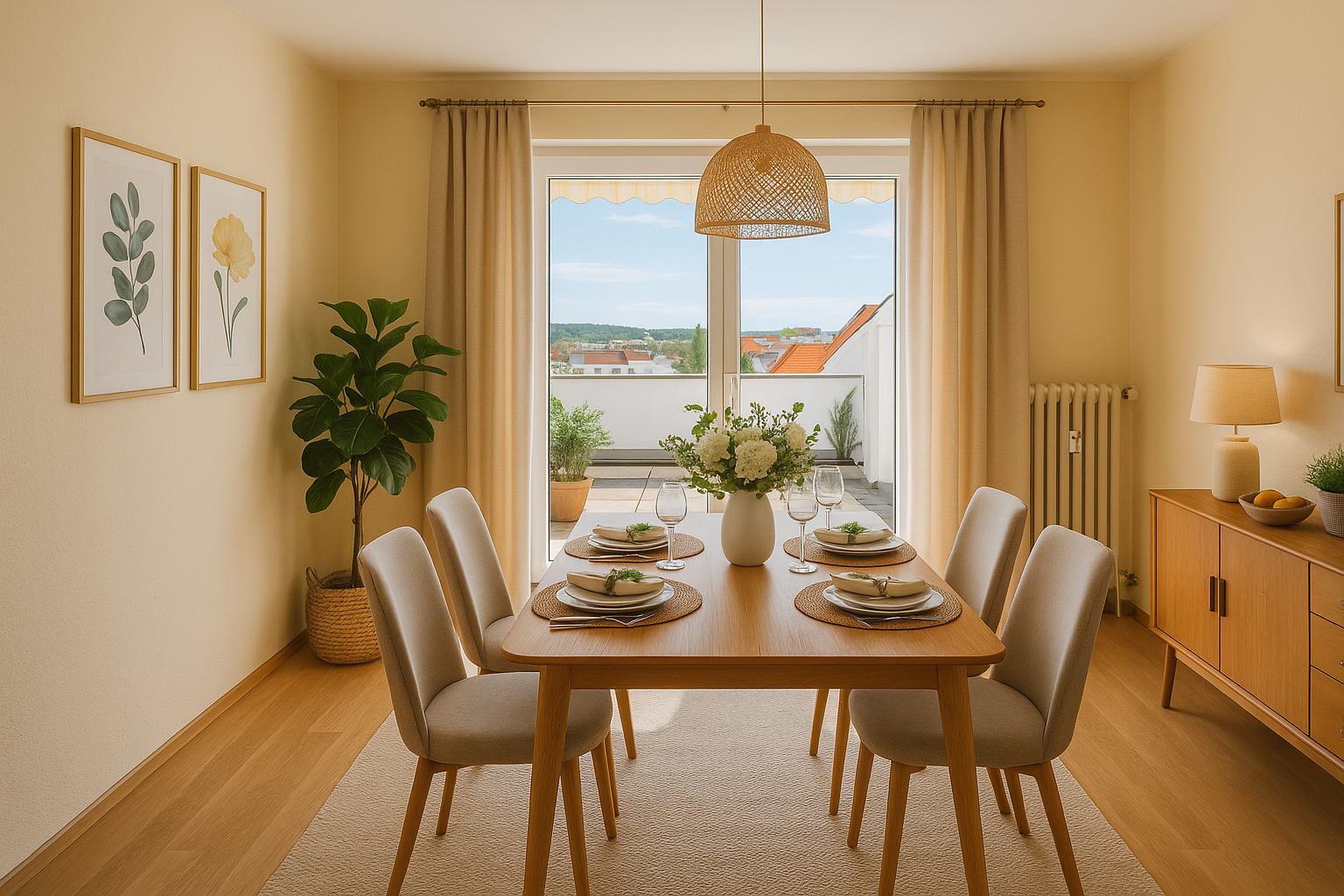 Esszimmer mit Zugang zum Balkon/Terrasse / bodentiefe Fenster Rollos